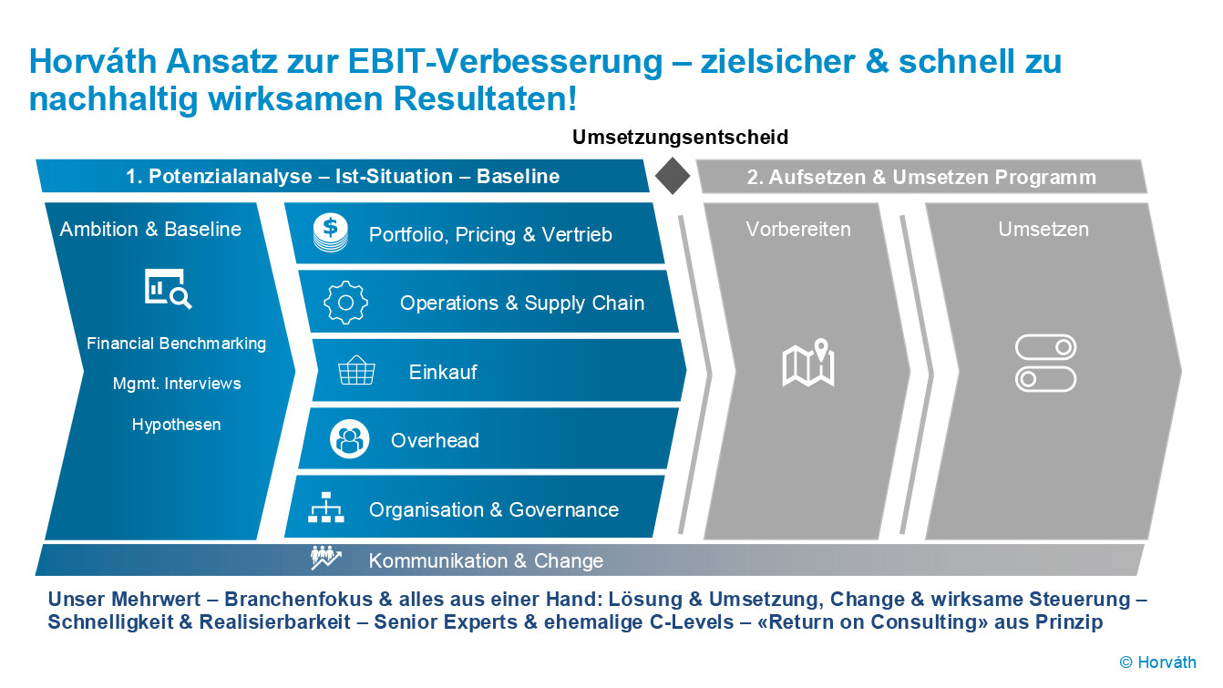 Karsten Klaus: Unabhängig von Branche oder Unternehmensgrösse haben Erhalt und Steigerung von Profitabilität und Margen aktuell oberste Priorität. Horváth kommt aus dem Performance-Management; die Unterstützung von Unternehmen bei der nachhaltigen EBIT-Optimierung ist eine unserer zentralen Dienstleistungen.