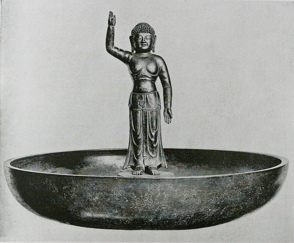 Shaka (Buddha) bei der Geburt und Waschbecken Bronze, Statuenhöhe 47 cm, Durchmesser des Beckens 89 cm, 8. Jahrhundert, Tōdai-ji, Nara, Japan. Bild: ASUKAEN ed. ,TOYO-BIJYUTU Special Issue NARA period 2nd, 1933-02-01