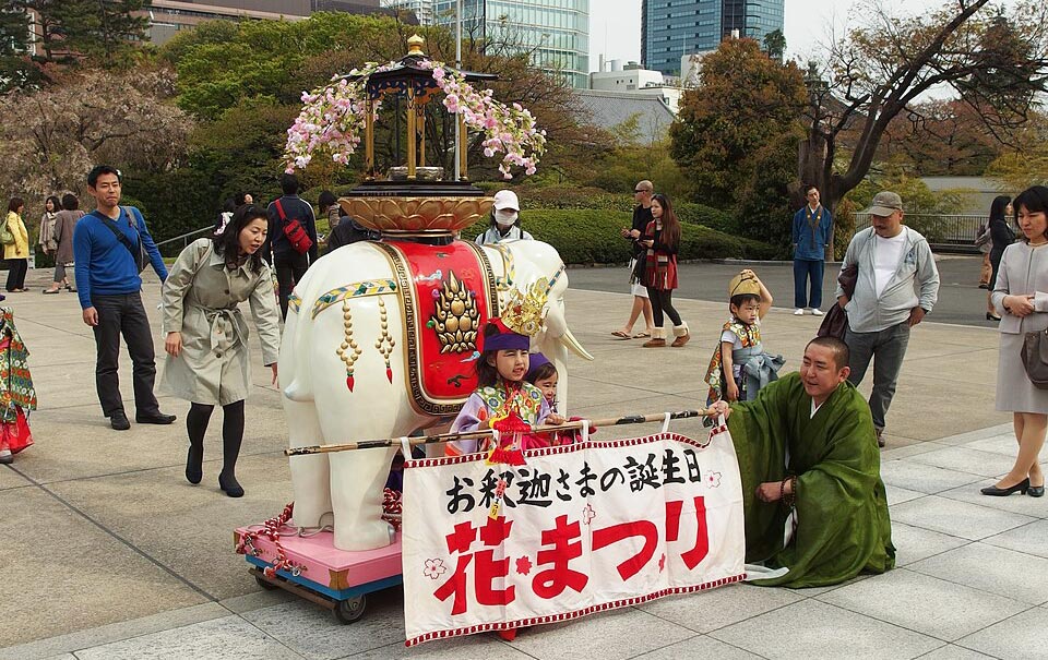Eine Statue des neugeborenen Buddha, deren rechte Hand in den Himmel und deren linke Hand zur Erde weist, wird zu Hana Matsuri in den Tempeln Japans aufgestellt und mit Blumen geschmückt. Wie Kathi Donaczis Bachelorarbeit an der Humboldt-Universität zu Berlin angibt, rief der neugeborene Buddha der Legende nach: «Zwischen Himmel und Erde bin ich allein verehrungswürdig.» Den Tempel selbst gestalten die Gläubigen als Blütentempel, der den Garten Lumbini darstellt.