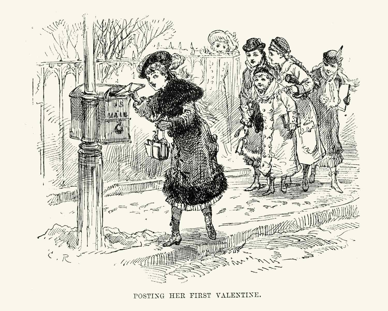 Historische Gravur eines Mädchens, das seine erste Valentinstagskarte verschickt, New Orleans, 19. Jahrhundert. Bild: iStock/duncan1890